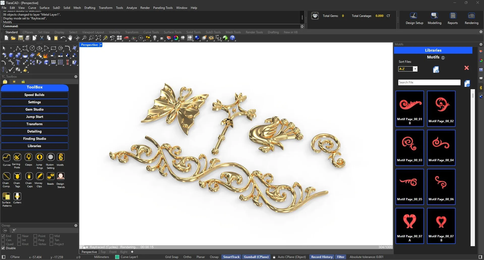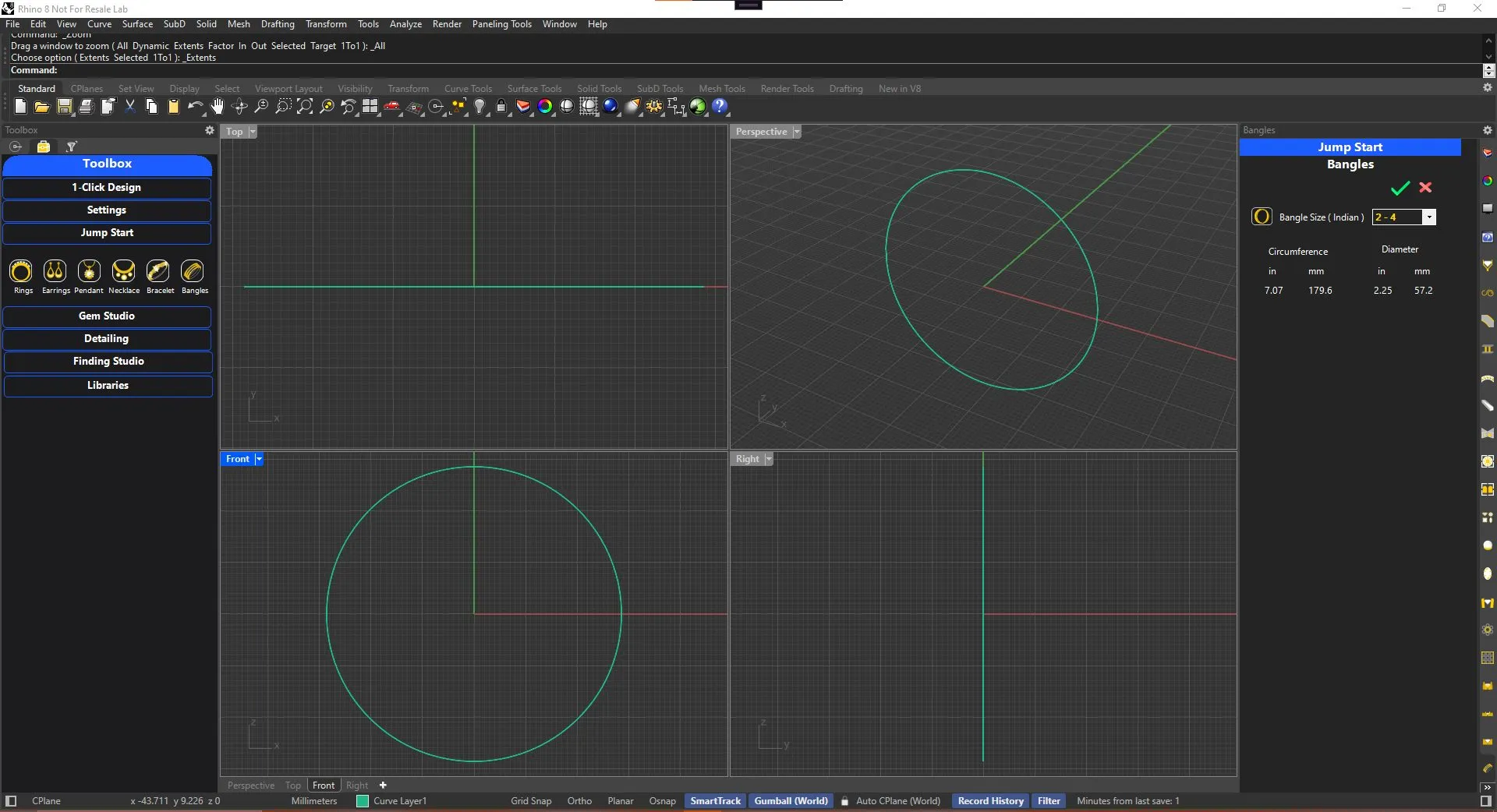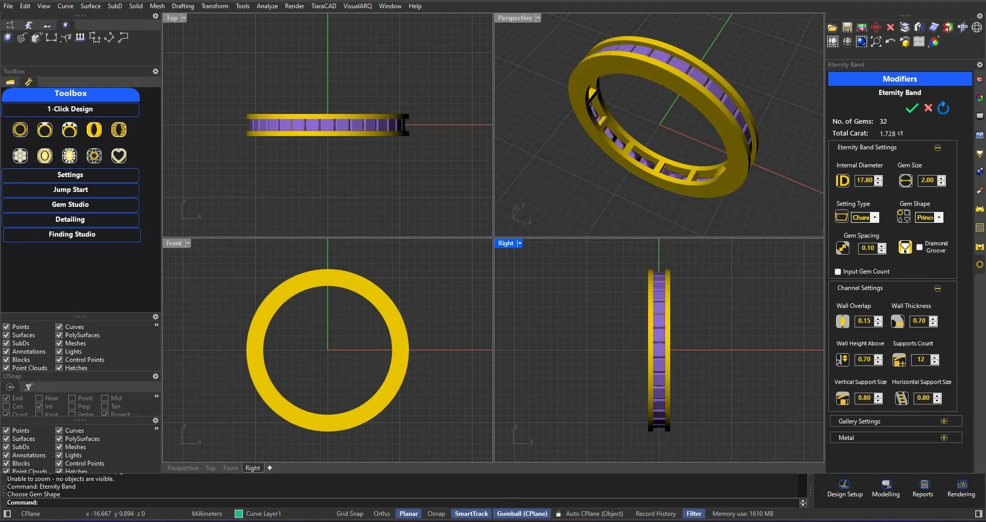 Just select 1 curve and find the entire pave set on the curve, complete with the desired wall thickness, depth of pavé and cutters in one go. Just modify your gem size and count as per your design and carat weight.