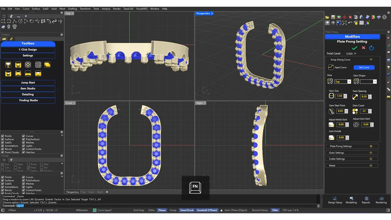 Create completed Plate prong setting just on selection of a curve as per your company standards. This includes the gems set, prongs with correct overlap and cutters all aligned as per the curve. Just choose your desired gem size and count. Plus additional modification on it also available.