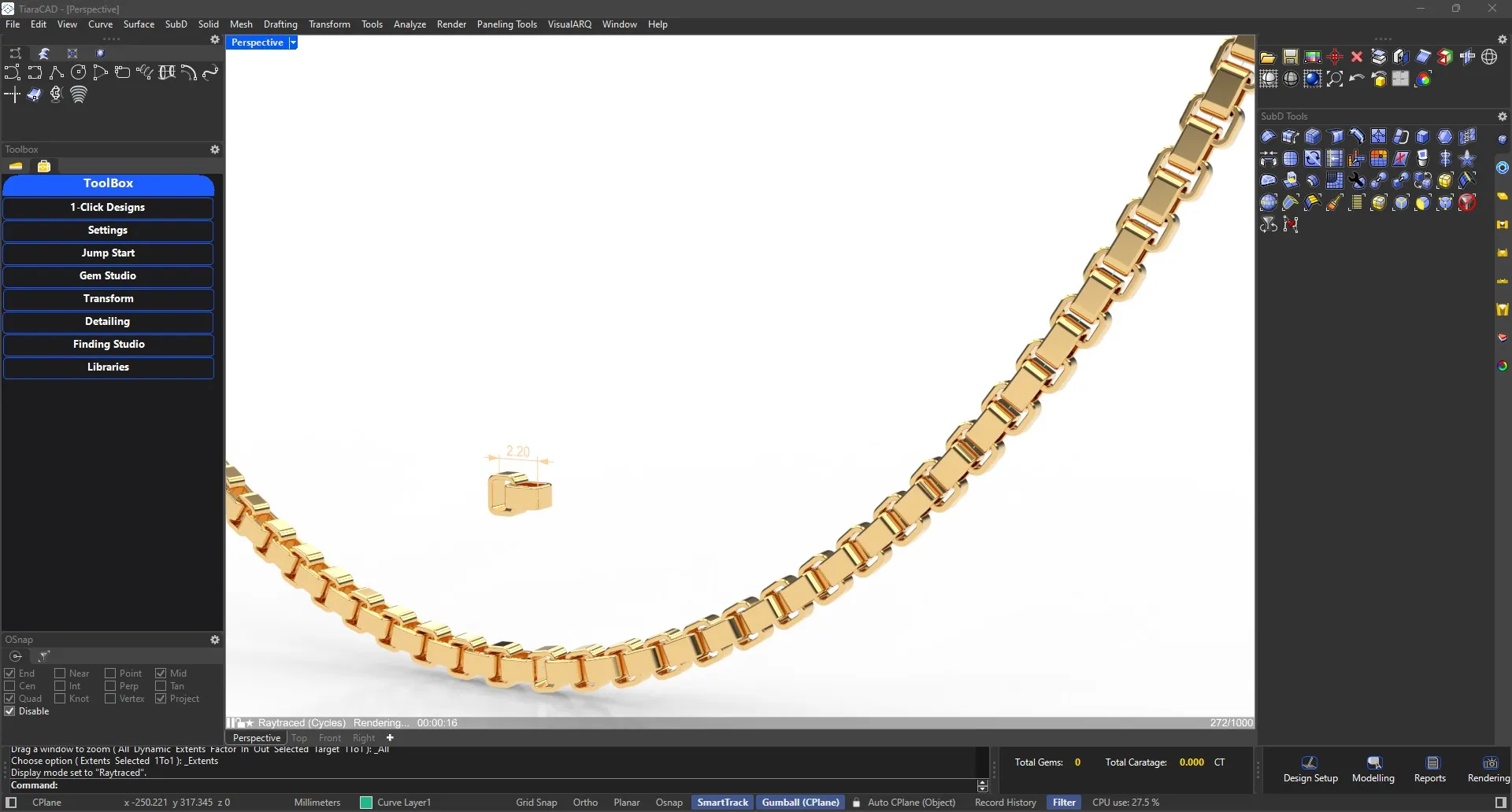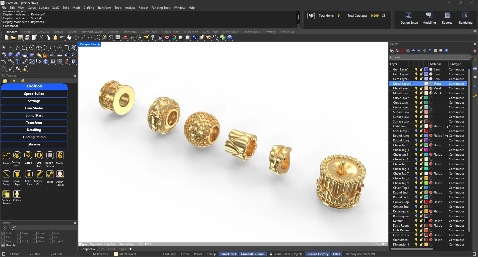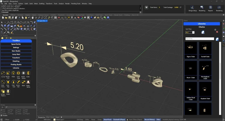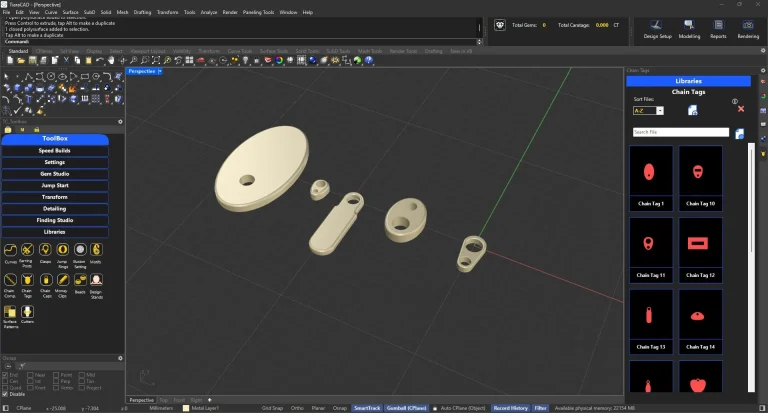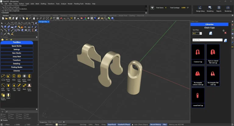 Volume calculation in TiaraCAD is based on the latest functionality. It allows for accurate volume detection. Based on the metal density chosen, weight of the chosen metal is calculated.