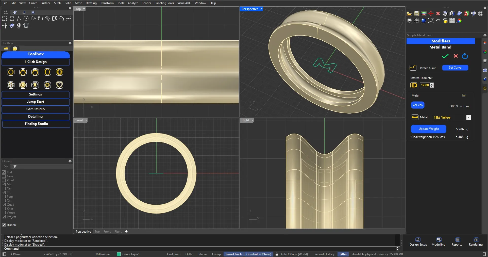 Simply add the desired ring size and the profile curve. Choose scooping if required. Design ready with metal volume for your perusal.