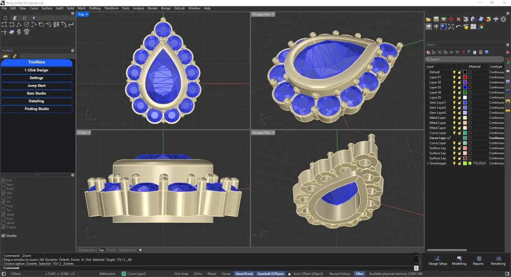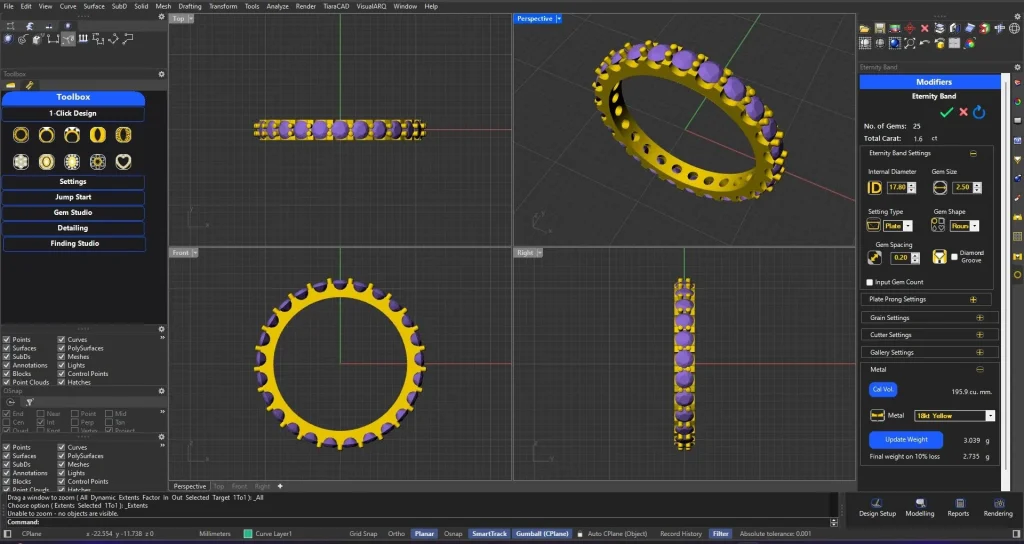Enter the Ring size and Gem size only. Choose your setting style and the design is ready with total Carat Weight and Metal Volume. In just one tool, you can use channel, plate-prong, collate-prong, nick, pave, bezel and even trellis setting without compromising on the manufacturing details.