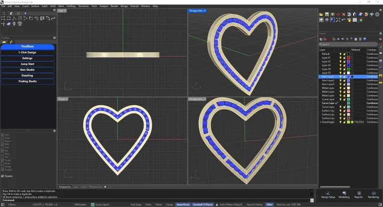 Choose gem size, overall heart size and setting for the gem. Optionally, add a gallery. Add a jump ring and loop from linkages to complete your design.